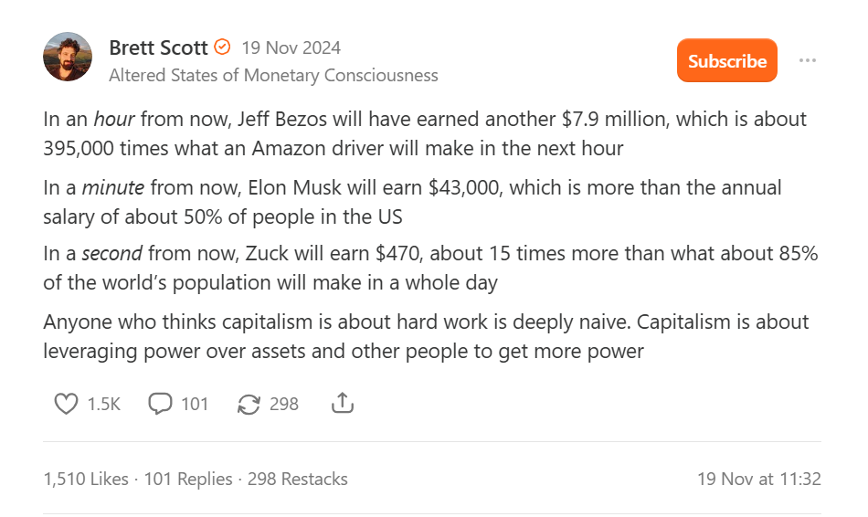 In reality, Bezos does not have the physical ability to actually cash in his soup vouchers. After all, if you made $7.9 million an hour, would you be able to spend it? Maybe you could manage for the first couple days, but soon it would become an exhausting activity. Even if Bezos had an entire team dedicated to spending his money on a 24-hour basis, they’d probably only get through a small fraction of it. So, he just lets the vouchers roll in, accumulating a vast war-chest of claims upon the collective soup. This is how they become billionaires.