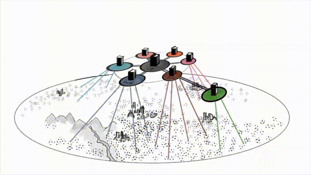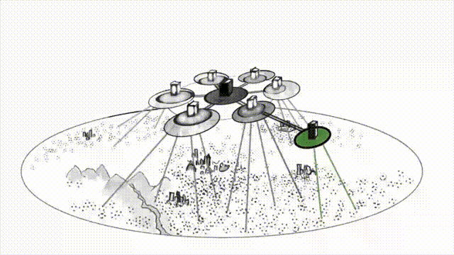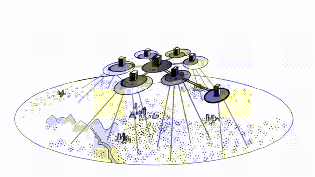 Us ordinary mortals on the ground can get addresses in those datacentres (what we commonly call ‘accounts’), which is where banks record their promises to us. We can make requests to have those edited by sending messages through phones and computers, or by walking into branches, all of which act as ground-level transmission posts to communicate with the bank). In the image I represent these connections between us and the banks as spokes.