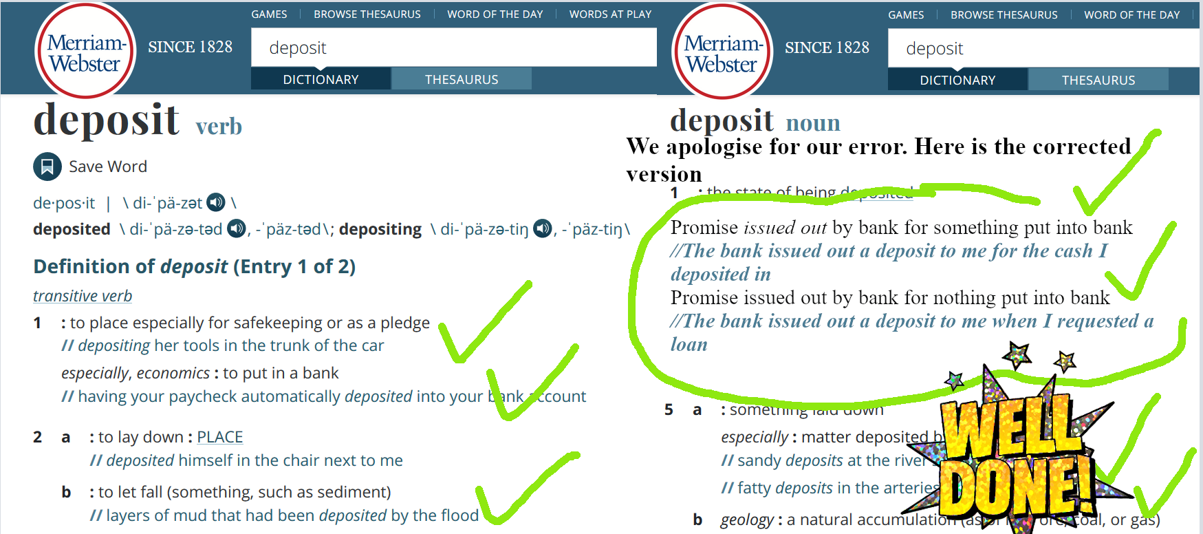 Following this linguistic convention, then, we are prone to thinking that we 'deposit a bank deposit'. Surely - much like the water we have poured into the glass - 'bank deposit' refers to money we have 'poured into’ the bank. Indeed, that's what reputable sources like the Merriam-Webster Dictionary say: according to them, a bank 'deposit' is 'money deposited in a bank'.