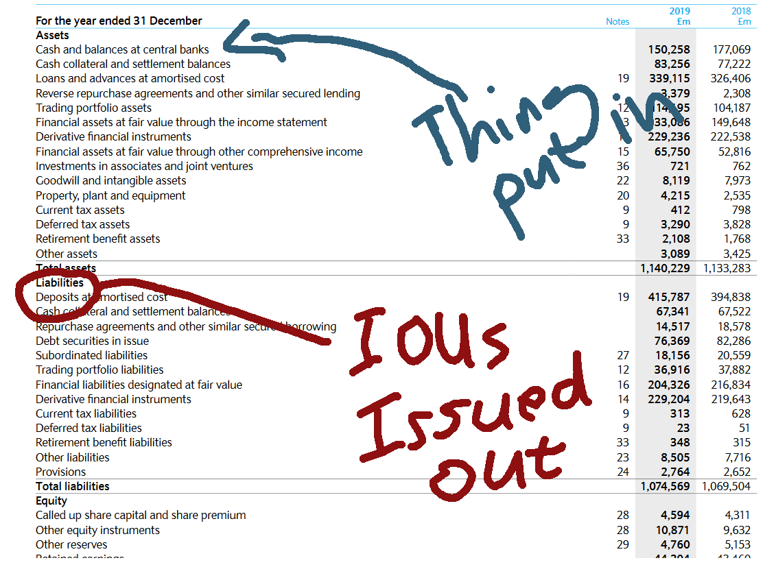 But it gets better. Do you notice that 'deposits' on the liabilities side of Barclays balance sheet far exceed the 'cash and balances at central bank' category in their assets section? In our water metaphor, this means 'the promises for water we've issued out far exceeds the water in our glass'.
